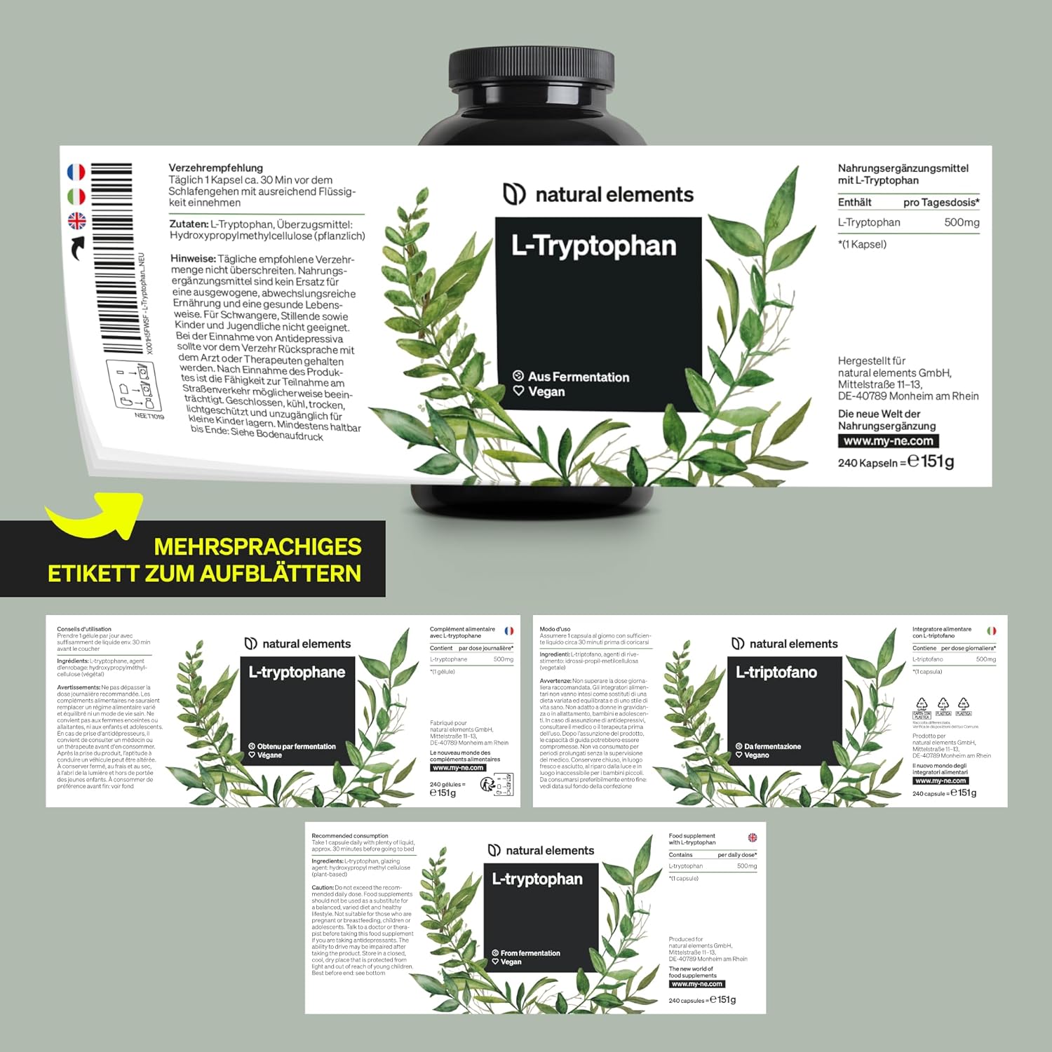 💚 DURCH UND DURCH VEGAN | 500mg veganes L-Tryptophan – sonst nichts. Unser hochdosiertes und optimal bioverfügbares Pulver gewinnen wir durch Fermentation von Reis – natürlich ohne Gentechnik. Und die Kapselhülle ist ebenfalls rein pflanzlich. YEAH!