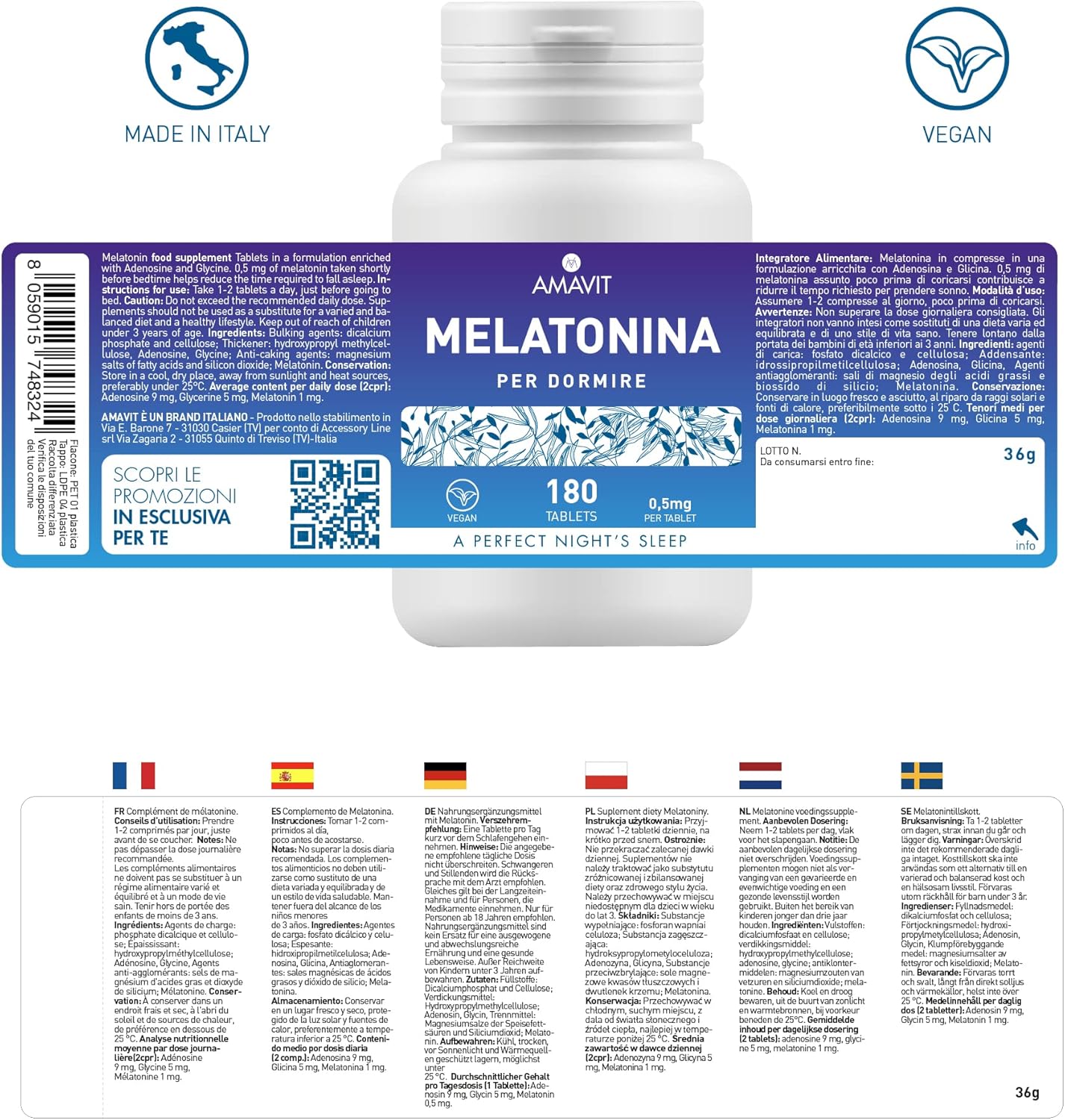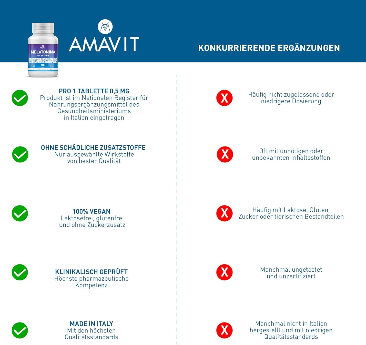 [MELATONIN TABLETTEN 0,5mg] AMAVIT Melatonin ist ein Nahrungsergänzungsmittel, das dazu beiträgt, den normalen Tagesbedarf zu ergänzen, um den Schlaf-Wach-Rhythmus auszugleichen und die Schlafqualität zu verbessern