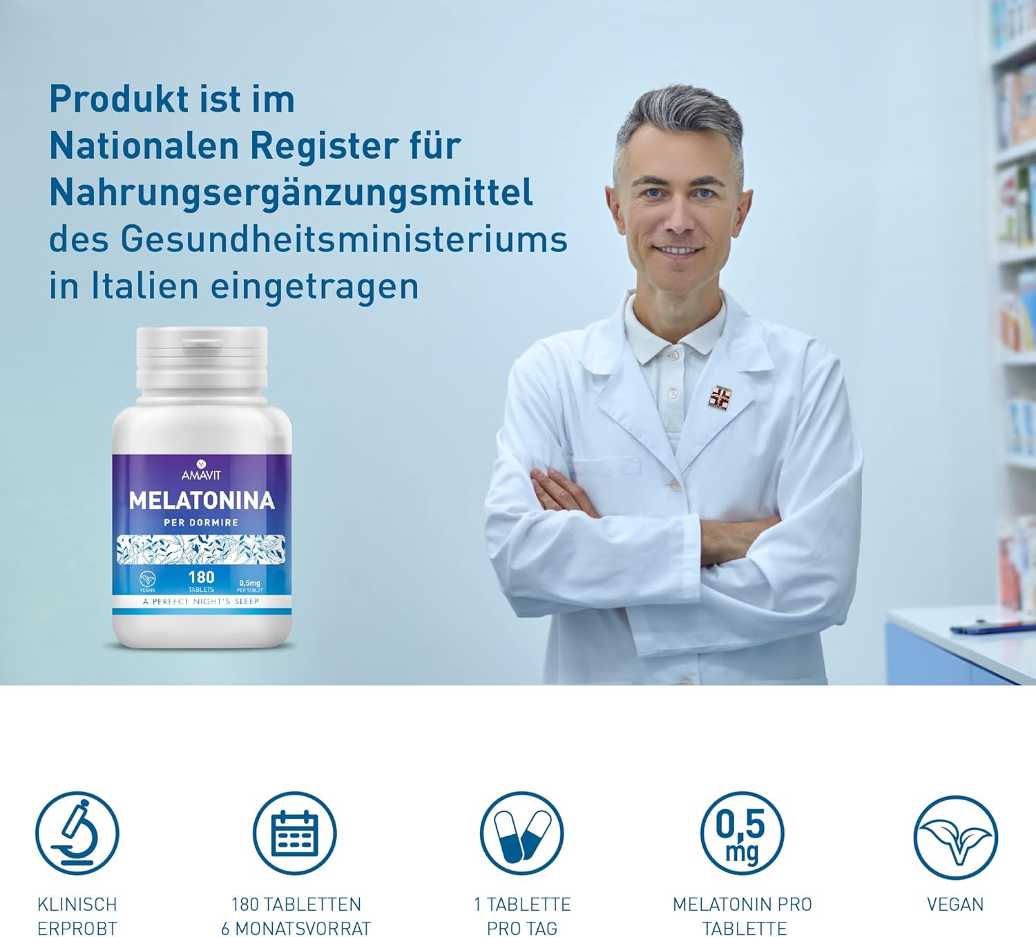 ![Melatonin Hochdosiert Tabletten [Leicht zu Schlucken] 100% Vegan - Nahrungsergänzungsmittel für Schlaf - Reines Melatonin mit Adenosin und Glycin - Gluten-und LaktoseFrei 0,5mg 180 Tabletten – Bild 5](https://schlafgut-24.com/wp-content/uploads/2025/03/81FQ4cvtMkL._AC_SL1500_.jpg)